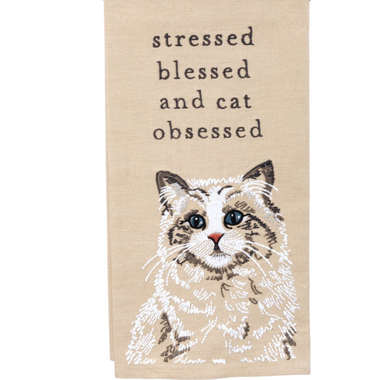 Cat themed embroidered kitchen towel - "stressed blessed and cat obsessed"