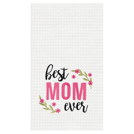 "Best Mom Ever"- Embroidered Waffle Weave Kitchen Towel